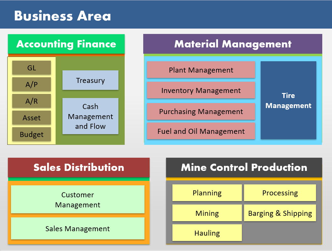 ERP merupakan aplikasi multi-modul yang saling terintergrasi satu sama lain dalam menjalankan bisnis proses yang ada. Syshab sendiri memiliki beberapa modul yaitu Preventive Maintenance, Material Management, Mine Control Production, Finance & Controlling (FICO) dan Sales Distribution. Dengan adanya sistem ERP memungkinkan perusaan untuk mengatur tiap bisnis proses seperti pembelian, produksi, akutansi dan lain-lain yang terintegrasi dalam satu kesatuan.